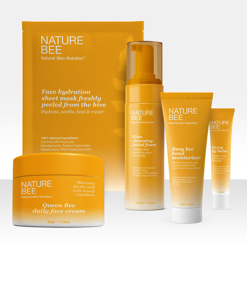 Royal Jelly, Manuka Honey, Tea Tree Oil, Kakadu Plum, Pink Grapefruit, Sweet Orange and more. Natural Skin Nutrition provided by Bees. Powered by Nature Bee HiveScience™